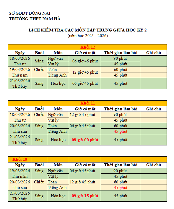 Lịch kiểm tra giữa kỳ 2 (2025-2026) các môn kiểm tra tập trung