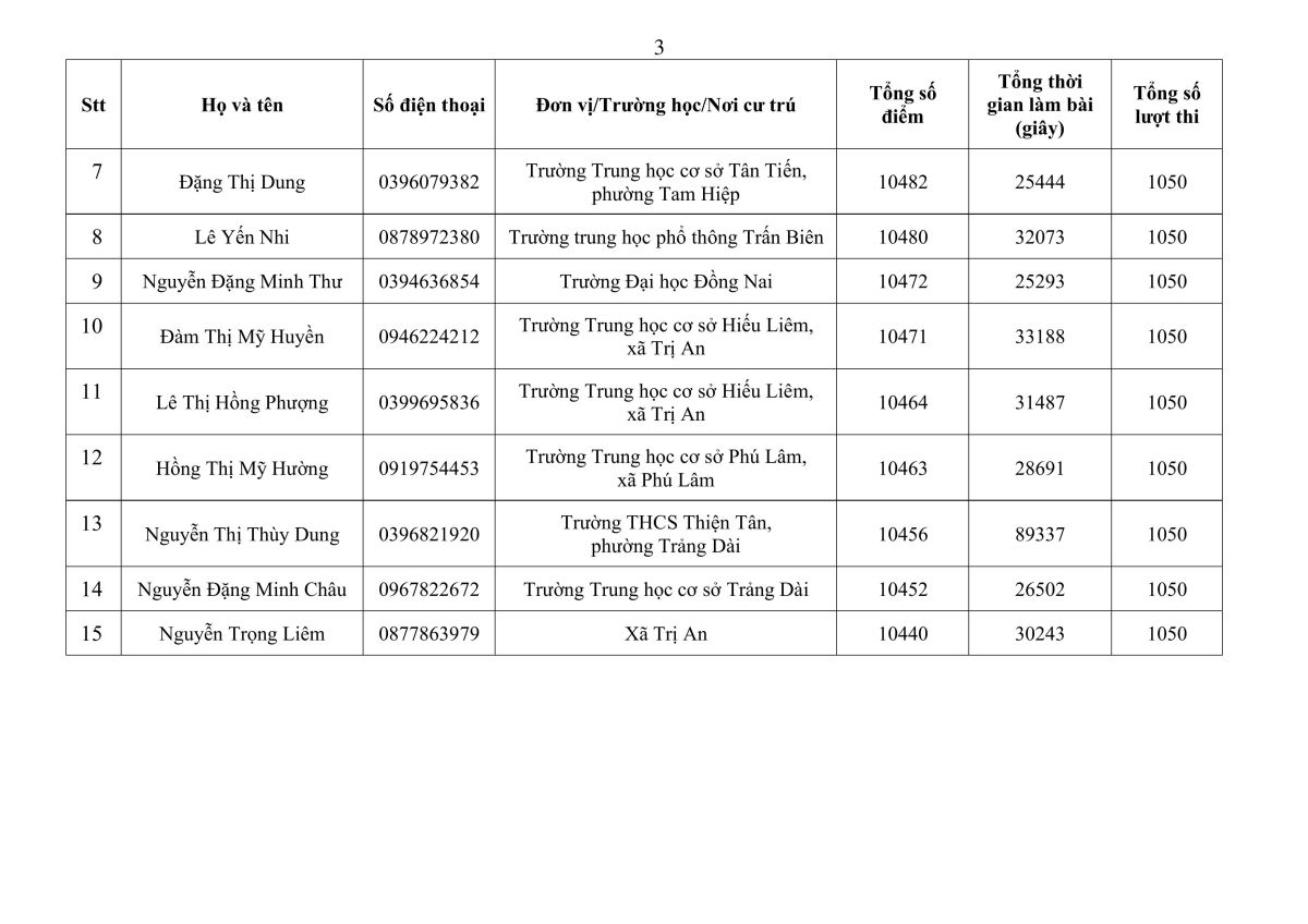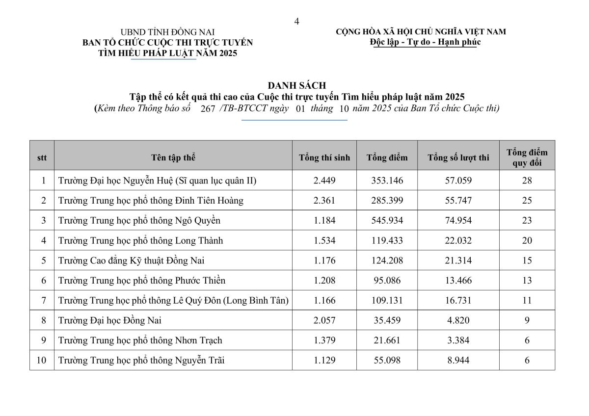 Cuộc thi diễn ra từ ngày 08 tháng 9 năm 2025 đến hết ngày 28 tháng 9 năm 2025 thu hút 540.042 lượt thi, trong đó, có một số cơ quan, đơn vị có số lượng lớn lượt thí sinh tham gia hưởng ứng Cuộc thi như Trường Đại học Nguyễn Huệ (Sĩ quan lục quân II), Trường Trung học phổ thông Đinh Tiên Hoàng, Trường Trung học phổ thông Ngô Quyền, Trường Trung học phổ thông Long Thành, Trường Cao đẳng Kỹ thuật Đồng Nai, Trường Trung học phổ thông Phước Thiền, Trường Trung học phổ thông Lê Quý Đôn (Long Bình Tân)… Kết quả này là nhờ sự tích cực phối hợp của các cơ quan, đơn vị, địa phương.