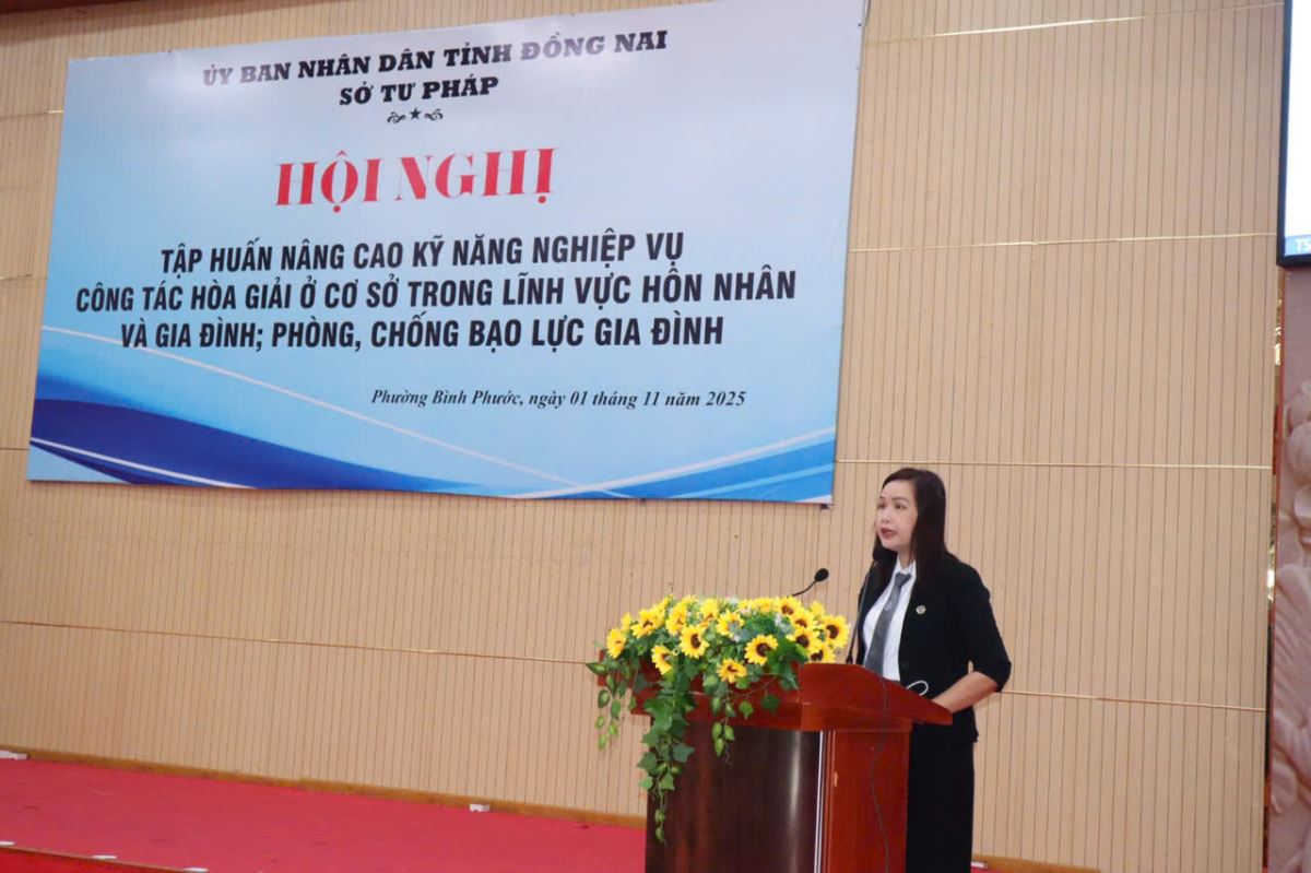 Ngày 01/11/2025, tại Trung tâm Hội nghị Trường Chính trị (số 68 Trường Chinh, phường Bình Phước, tỉnh Đồng Nai), Sở Tư pháp tổ chức Hội nghị tập huấn nâng cao kỹ năng nghiệp vụ công tác hòa giải ở cơ sở trong lĩnh vực hôn nhân và gia đình, phòng chống bạo lực gia đình. Hội nghị thu hút hơn 320 đại biểu là hòa giải viên ở cơ sở tham dự thuộc các xã: Bù Gia Mập, Hưng Phước, Đak Ơ, Phú Nghĩa, Đa Kia, Phú Riềng, Phú Trung, Đồng Tâm, Thuận Lợi, Đồng Phú, Phước Sơn, Nghĩa Trung, Bù Đăng, Thọ Sơn, Đak Nhau, Bom Bo và Thiện Hưng.