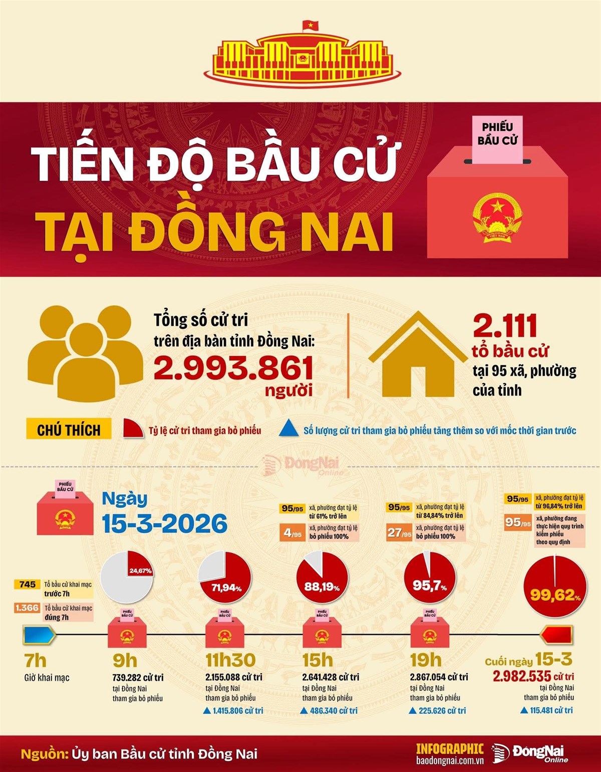 Theo Ủy ban Bầu cử tỉnh Đồng Nai, đến hết ngày 15-3, toàn tỉnh có tổng số 2.982.535 cử tri tham gia bỏ phiếu, đạt tỷ lệ 99,62%.